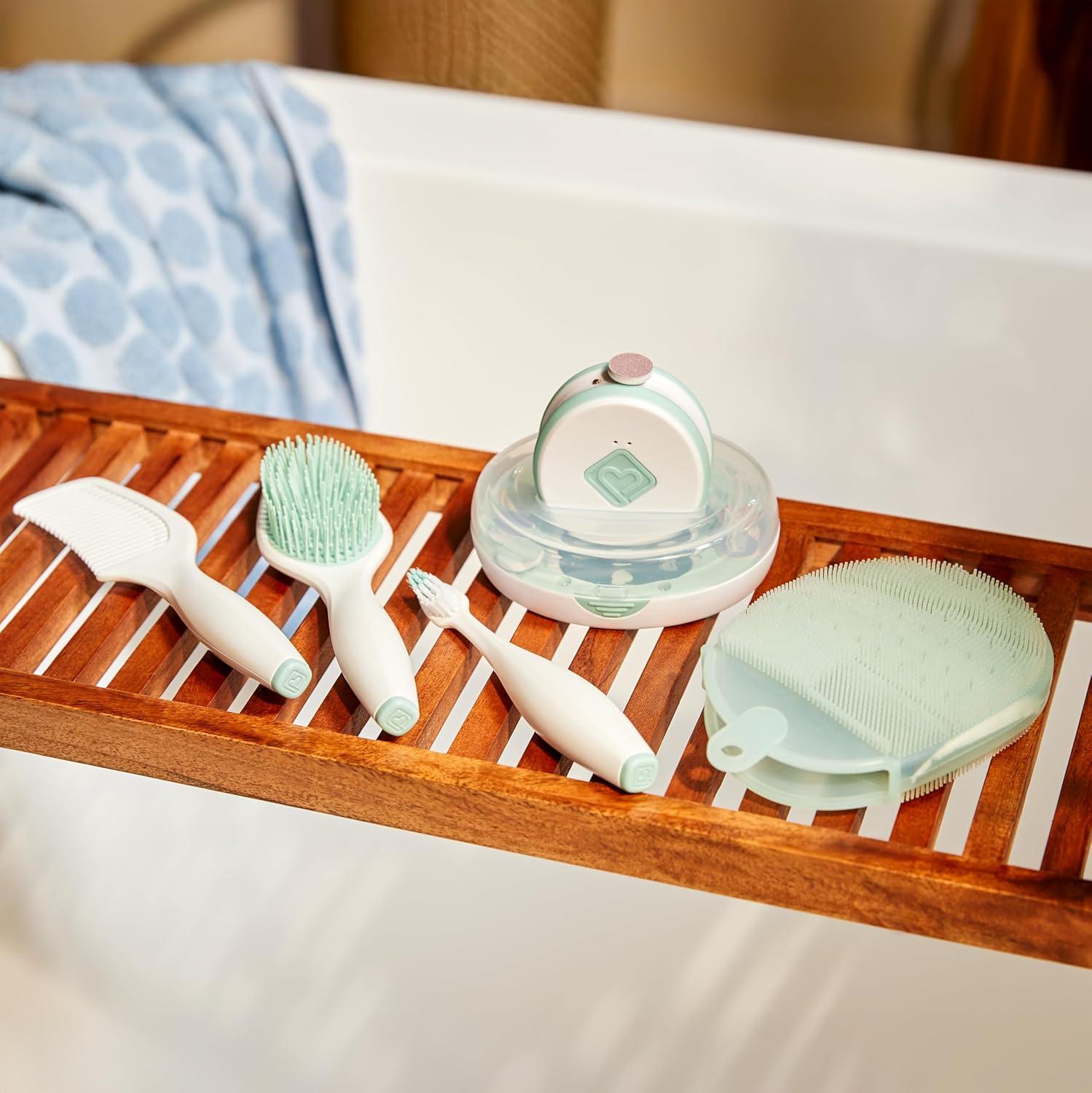 Our Babys 1st Spa Day has all the grooming essentials you need to pamper and care for your baby at home. Get ready for the arrival of your precious little one by adding this kit to your nursery, or give it as a baby shower gift to a friend or family member whos expecting. The Electric Ease Nail File is a gentle and easy-to-use tool that lets you care for your childs nails without cutting into their delicate nail beds or harming the surrounding skin. The hairbrush gently removes tangles, and the large-handle comb keeps your babys hair looking neat and stylish. You can also delicately wash your baby with the soft bath mitt. As your little one becomes more independent, they can use the included toddler toothbrush to brush their teeth on their own.