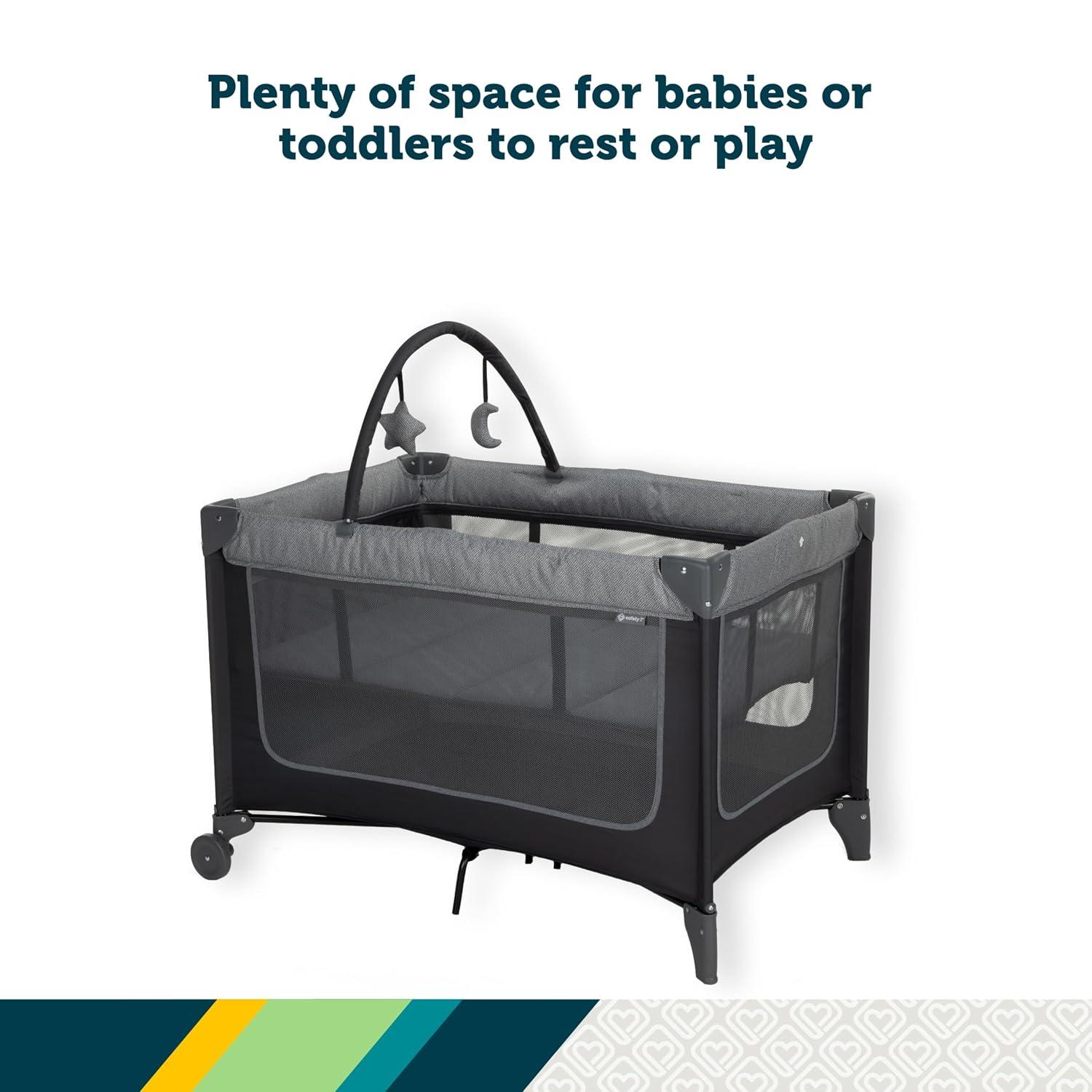 The Safety 1st 4-in-1 Portable Play Yard with Bassinet, Napper, and Flip-Away Changer has plenty of space for babies or toddlers to rest or play. This portable play yard works at home or on the go and features a removable full bassinet, a detachable infant bassinet, and a removable changer that stores easily when not in use. The side storage pockets are ideal for storing accessories, and the two wheels make it easy to move from room to room. When it's not in use, the 4-in-1 Portable Play Yard with Bassinet, Napper, and Removable Changer folds up into the included carry bag for simple storage. This product is designed with a firm, flat sleeping surface that meets the Consumer Product Safety Commission’s recommendations for safe sleep.