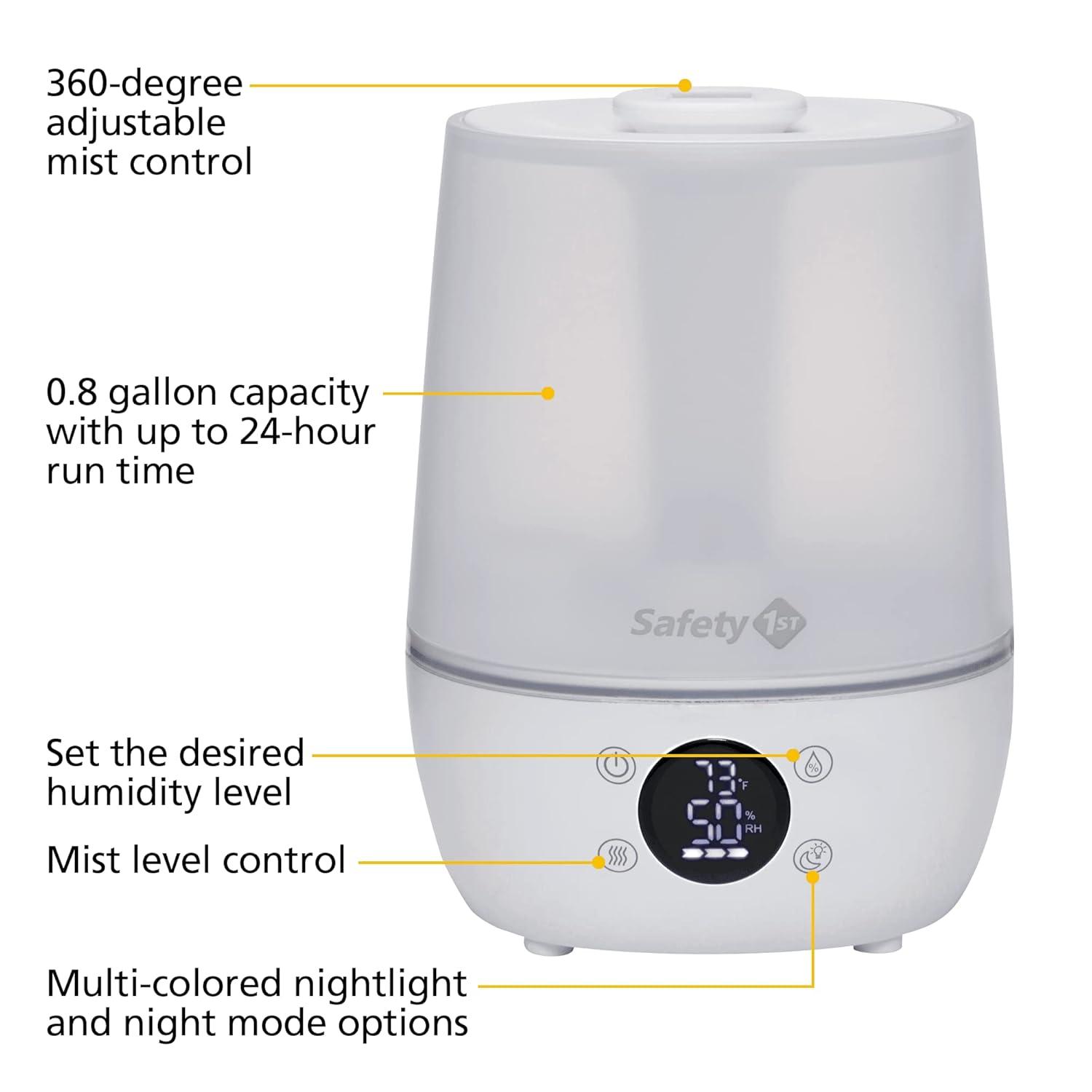 Whether it’s cold and flu season or any time of the year, it’s best to maintain a humidity level of 30-50% in your little one’s nursery. The Humid Control Filter Free Humidifier helps you do just that with it’s easy-to-program hygrometer that detects and regulates the humidity. Just set your desired humidity level to maintain your ideal conditions.The humidifier is equipped with 360-degree adjustable mist control, so you can position it in any direction that works best. It also has a compact design that allows you to place it just about anywhere you need it.For those times when the water in the humidifier gets too low, there’s a built-in feature that automatically turns it off.It comes with a multi-colored night light that has a variety of color options to beautifully match your nursery. Plus, you can fill the room with a soothing aroma with the diffuser by using the included 100% natural oil blend scent pad.